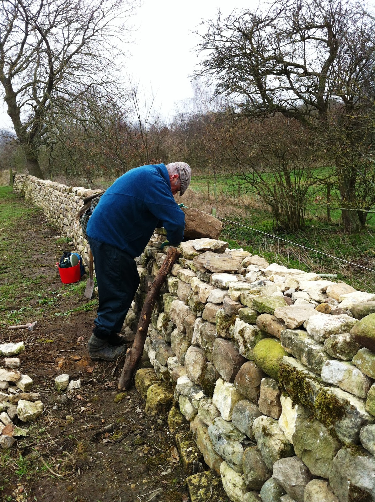 Meanwhile back at the wall face Phillip and Roger steadily added our contributions to the last remaining uncapped section of wall. The final stones were in place shortly after lunch and we dedicated the rest of our time to chucking... er tidying the left over stone to the non visible side of the wall and filling the breach between the new wall and old wall.